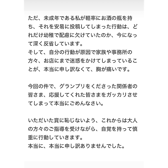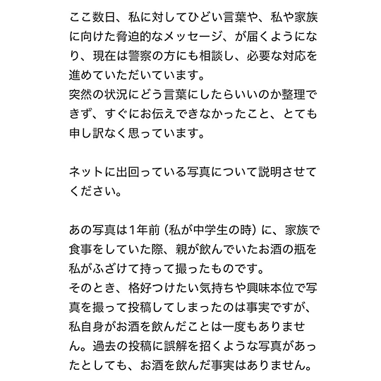 過去の投稿に誤解を招く写真があったとしても、お酒を飲んだ事実はありません