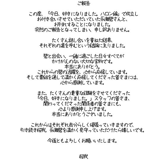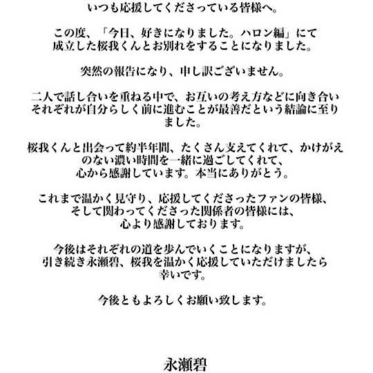 ✔︎︎︎︎別れた理由は詳しく明かされておらず、「が話し合ってそれぞれの道を歩むという結論になった」とだけ報告文に書かれている