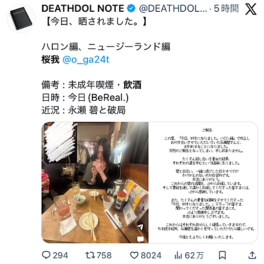 デスドルが、破局報告の数時間後に「おうがの未成年飲酒・喫煙」を暴露していましたが、おうがとは別人です。
