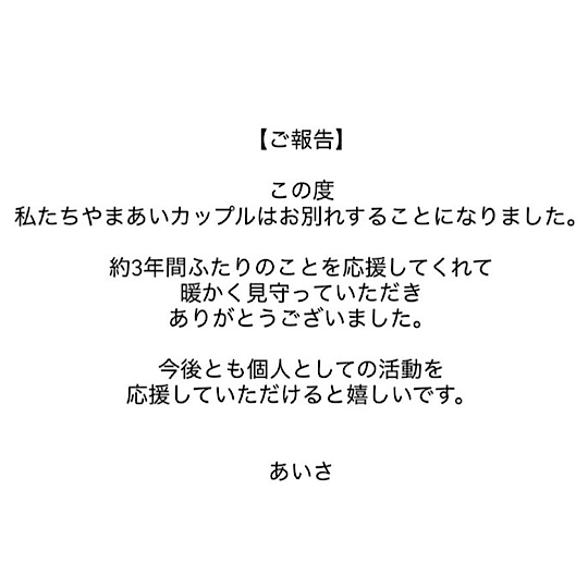 やまあいの2人は1月29日、Instagramのストーリーで破局を報告しました。