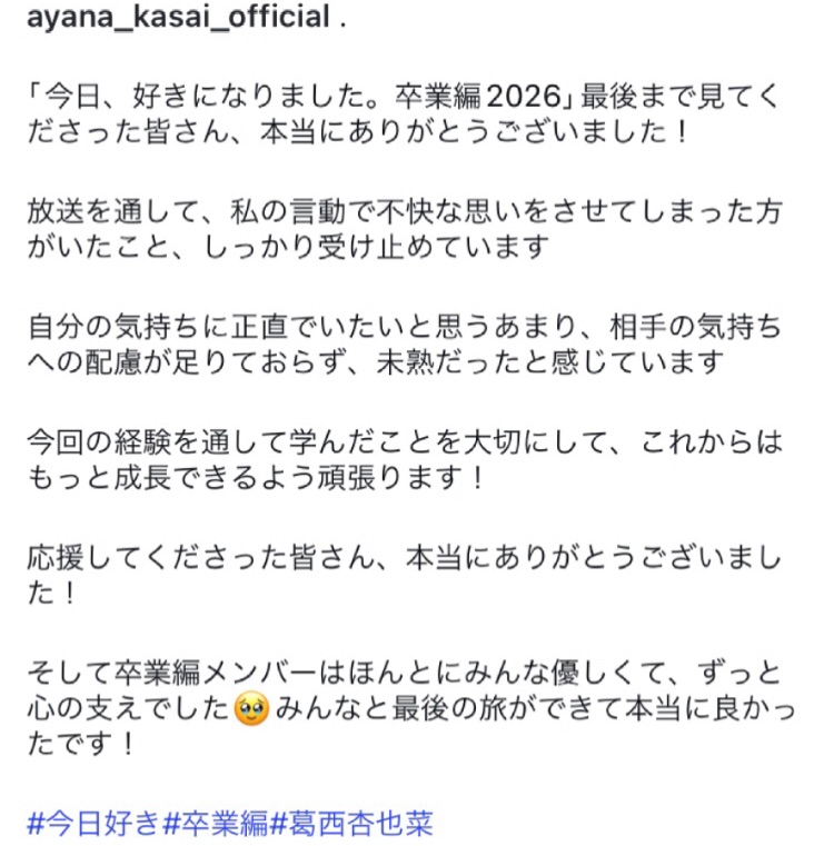 セブンティーンモデルの葛西杏也菜が3月はじめ、「今日好き」卒業編2026の3話での発言で炎上しています。