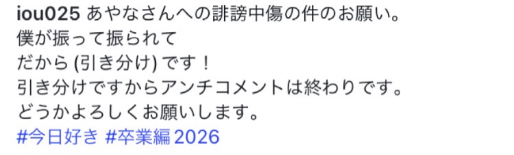 ✔︎︎︎︎卒業編のあと、あやなは声明を出し、いおうも「あやなへの誹謗中傷に対する注意喚起文」を出し、炎上はおさまり、一件落着