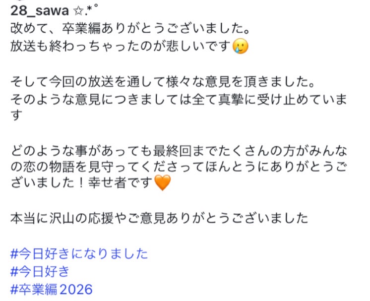✔︎︎︎︎紗和は卒業編の最終話のあと、「様々な意見があったが、真摯に受け止める」とだけ、Instagramの投稿文に書いた